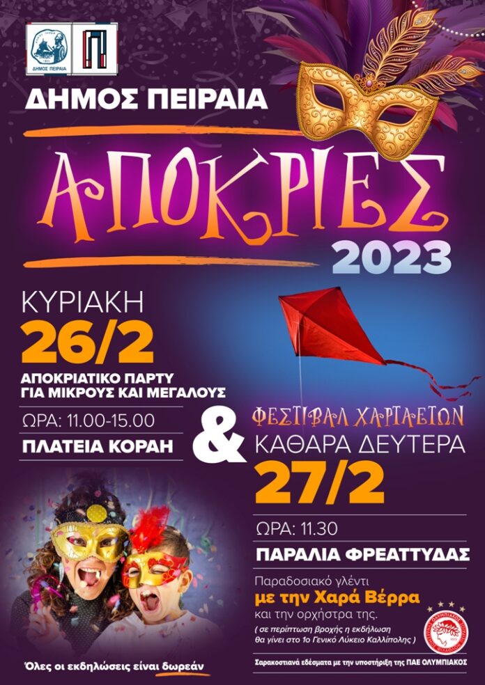 Ο Δήμος Πειραιά διοργανώνει εκδηλώσεις το τριήμερο της Αποκριάς για όλη την οικογένεια στην πλατεία Κοραή, καθώς και τα καθιερωμένα, παραδοσιακά Κούλουμα στην παραλία της Φρεαττύδας.